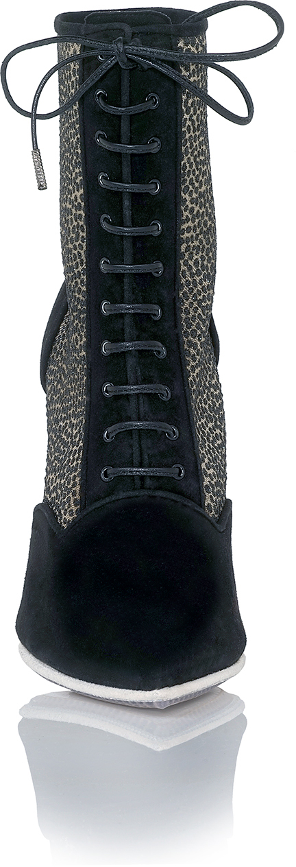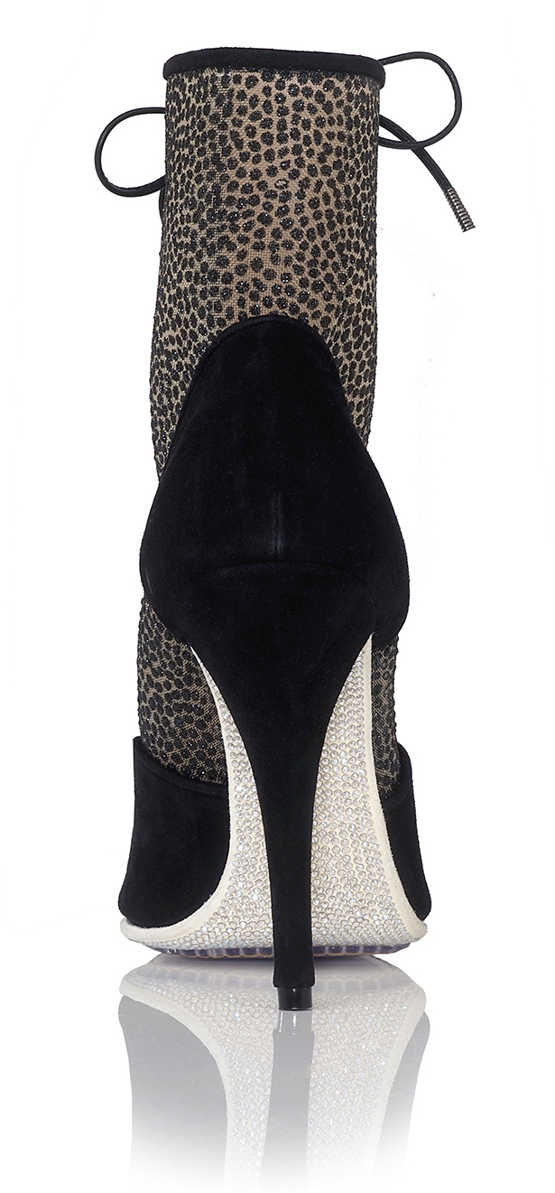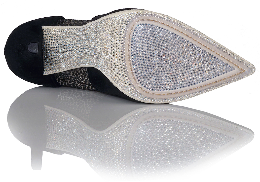 Shown in Black Suede and Glitter Spot Mesh with unique Crystal Sole
