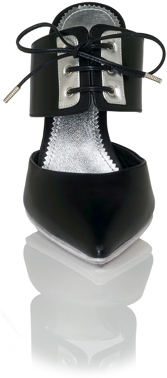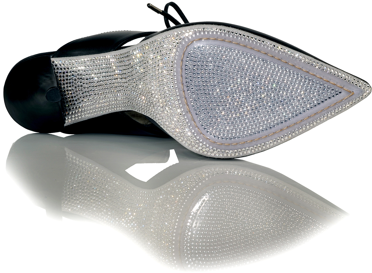 Shown in Black Jazz, Matte Silver Detail around Lace Area with unique Crystal Sole