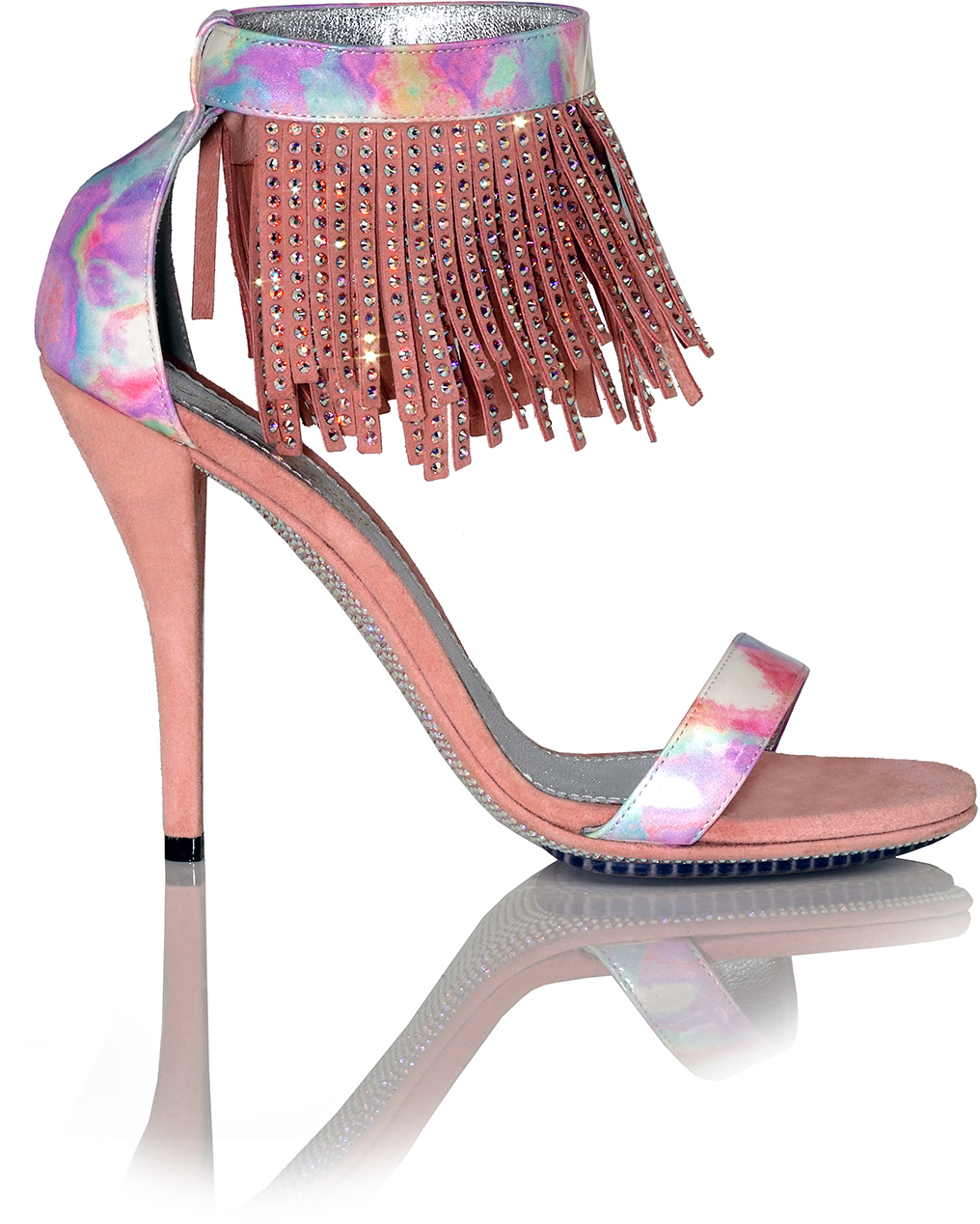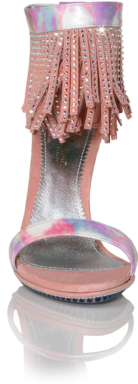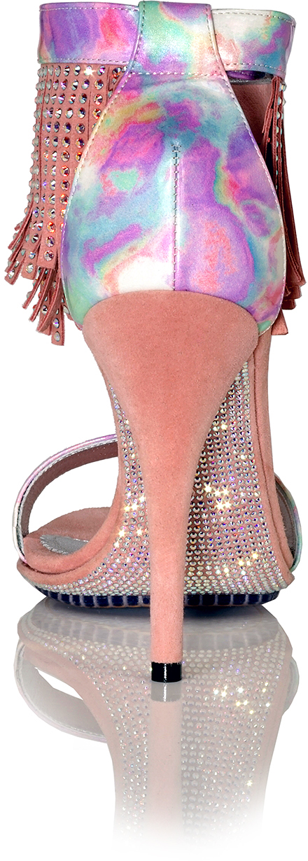 Shown in Picasso Vernice Tremonto Patent (Pink Pastels), Pink Suede Heel and Iridescent Crystal Fringe with unique Iridescent Crystal Sole